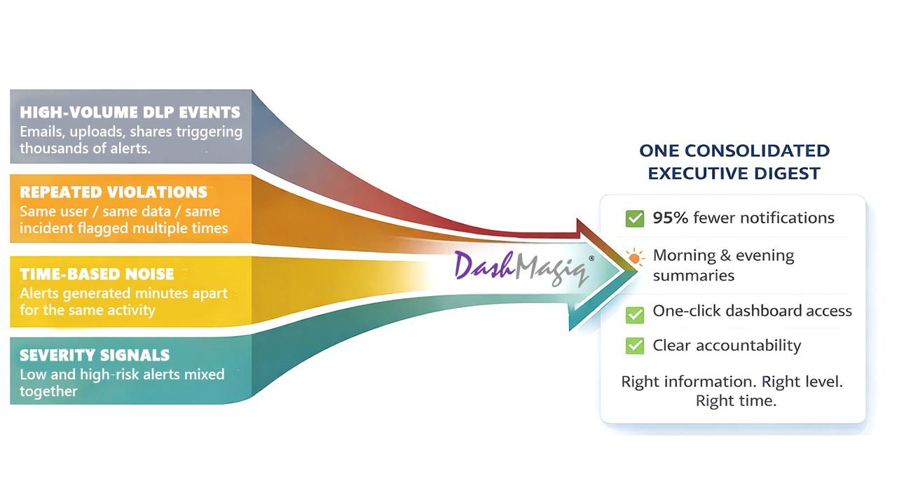 A leading banking and financial institution leveraged its DLP system to enforce policy compliance and track data‑sharing violations. In line with its governance framework, the system was configured to generate notification alerts for every DLP event. While this approach enabled rapid frontline response, it proved unsuitable for engaging senior management during incident surges or broad policy violations. Senior executives and top management were flooded with hundreds of alerts daily, overwhelming inboxes and undermining the intended efficiency of the workflow.